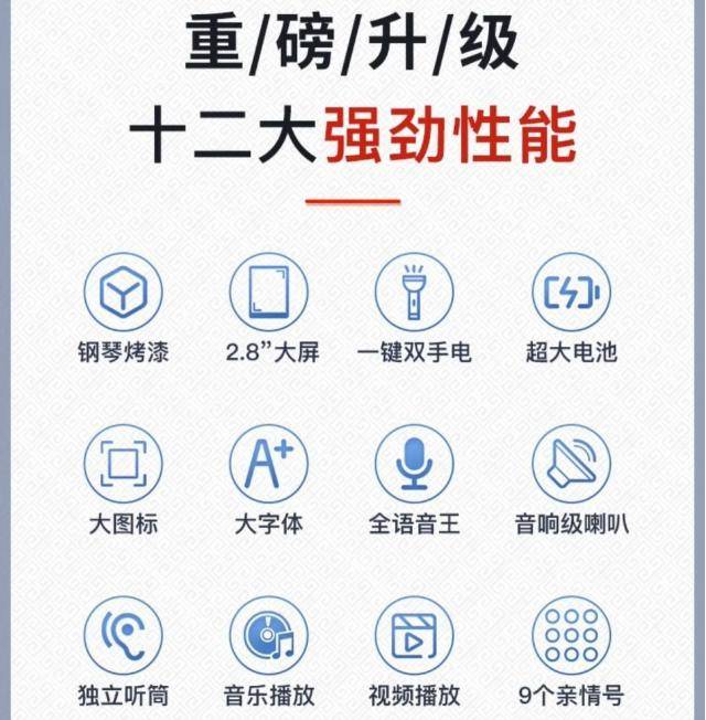 专为长辈设计,细节之处见线老年手机,每一处设计都凝聚了对长辈的深切关怀。2.8英寸的大屏幕,搭配超大字体和图标,让视力不再成为阅读的障碍。高清大屏不仅清晰易读,更能在视觉上带来舒适的享受。而高达90分贝的洪亮音量,配合音响级喇叭,无论是接打电话还是听音乐、听广播,都能让声音清晰饱满,声声入耳,让长辈在享受科技便利的同时,也能感受到家人的温暖与陪伴。